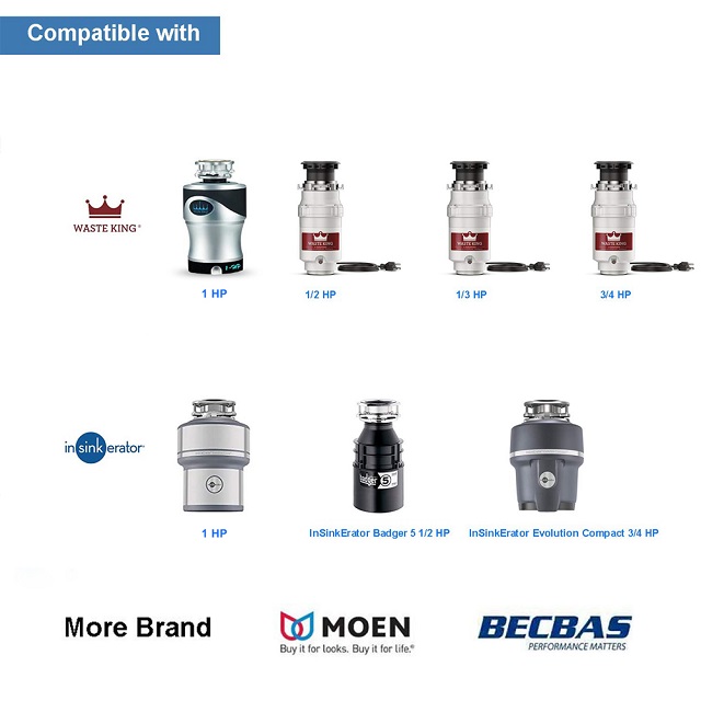 16A 1800W wireless switch kit works with all the 1/3 HP, 1/2 HP, 3/4 HP and 1 HP food waste disposers, includes Waste King Series and InSinkErator Badger Series food waste disposers; 5 years warranty, FCC, CE and RoHS certified
